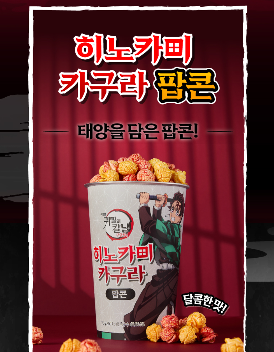 • 히노카미 카구라 팝콘 — 탄지로의 기술 모티브, 붉은 불꽃을 형상화한 팝콘으로 콜라보의 상징 아이템.